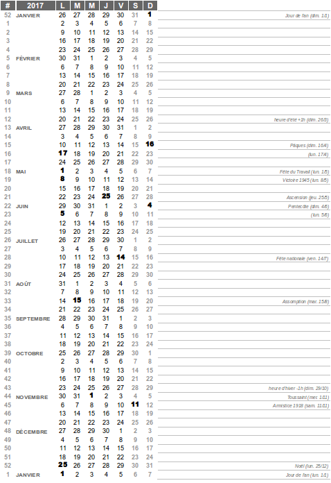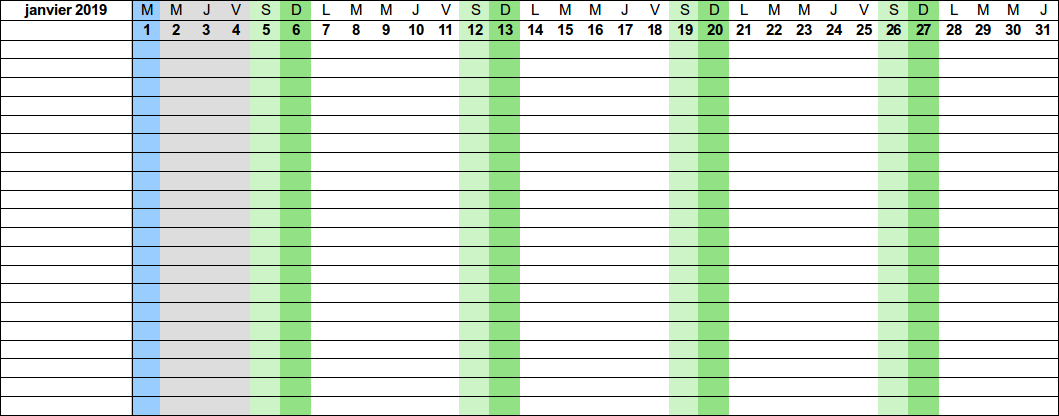 ✓ possibilité d'ajouter des événements personnalisés en couleur (sans couleur dans la version Excel)